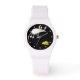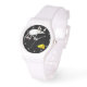 Drôle souris blanche avec pieds et oreilles roses, bondissant dans l'air au-dessus d'un coin orange de fromage. Arrière - plan noir avec points blancs. Amusez-vous à passer du temps avec cette très mignonne montre bracelet!