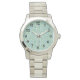 Cette montre pour femmes a un design Boho de spirales se chevauchant en bleu et vert sur un champ de blanc.