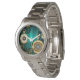 Bijoux, montre en or avec chaîne d'or et clés sur un arrière - plan texturé vert. Style Steampunk.