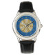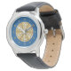 Un mandala en forme de dentelle concentrique en bleu foncé avec des points bleu vif et dorés comme des étoiles qui s'étalent entre les couches et un cercle en dégradé de soleil brillant derrière fait un design amusant qui rappelle un ciel étoilé et une journée ensoleillée brillante avec une image. Cette montre est disponible dans une variété de tailles, de couleurs et de styles, y compris des tailles pour les enfants et les adultes.