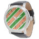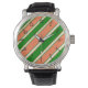 Cette montre aux rayures de corail et de diagonale verte fait une déclaration de mode audacieuse.