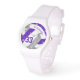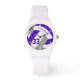 Cette mignonne montre de volley-ball pour filles comporte des chiffres blancs de visage d'horloge et un graphique de volley-ball violet, gris et blanc sur lequel vous pouvez customiser son nom et son numéro de maillot - les panneaux de volley-ball violet et gris sont mélangés avec un motif kaleidoscopique girly floral - par katz_d_zynes