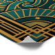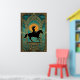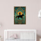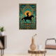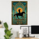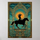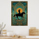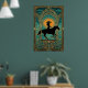 Un hommage architectural majestueux à l'esprit de l'Ouest. Cette œuvre d'art présente une silhouette noire d'une cowgirl chevauchant un cheval, présentée comme un monument au sommet d'un piédestal Art déco orné. Encadré par une arche géométrique de style cathédrale et un sunburst orange vibrant, le ciel de teinte sarcelle foncée est parsemé d'étoiles et de nuages stylisés. Parfait pour un ranch moderne, une étude sophistiquée ou un mur de galerie unique.