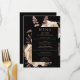 This elegant, moody wedding menu features a lush, romantic floral bouquet in ivory with rose gold faux foil and glitter foliage on a black background. Customize the rose pink text in stylish fonts on a black rectangle. The back of the card is solid black.