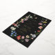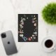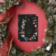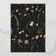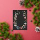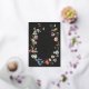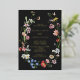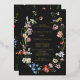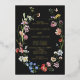 An elegant moody boho wedding invitation featuring an open floral wreath with colourful watercolor Dutch still life flowers on charcoal background. All text is in real gold foil. The reverse features a loose pattern of flowers.