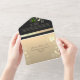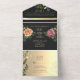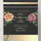 Elegant, modern, moody romantic black all-in-one wedding invitation with faux gold floral lace, watercolor pink and orange rose flowers and custom picture of the couple at the back. Add your photo, wedding details and rsvp.