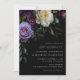 Elegant moody floral wedding invitations featuring an arrangement of purple and burgundy flowers, lush green foliage, and dark berries at the top left corner of the design. "The Wedding Of" is displayed in elegant, modern typography. Personalize the purple floral wedding invitation with your names and wedding details. The invite reverses to display your vertical engagement photo framed in black with a purple floral pattern. The design coordinates with our Moody Gothic Floral wedding collection.