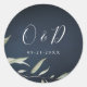 Modern chic minimal watercolor botanical foliage greenery design on moody navy blue background, with couples monogram in the centre, great seals for modern wedding, rustic wedding, and botanical garden wedding in summer and fall.