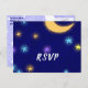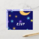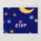 A custom RSVP postcard with script and hand-style letters for response info, your return address, the address for responses with a cover of deep blue sky with a moon and colourful stars on the front, and a light blue etching of a sky and stars on the back.