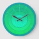 Contemporary celestial mandala clock clock in gradients of emerald green, turquoise and peacock,with a teal blue background, featuring a crescent moon and a burst of stars against concentric circles