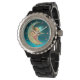I had two concerns when ordering this watch - one that the watchband didn't look that glittery and two that the dial would be too large. Neither was a problem at all. The watch band is nice and glittery for a touch of bling. As to the size, I have small bones so I tend to like smaller looking accessories and I am quite comfortable with this. Neither too large or too small. The outside edge to edge on the dial is 1 1/4" the inside image is 1 inch.