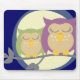 Cute kawaii style owls perched on a branch with the moon in the background.