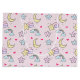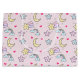 A cute pattern with happy stars, moon, clouds and rainbows on a soft pastel pink background.