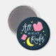 Show off your bookish side with this bookish magnet featuring the words "All Night Reader" surrounded by yellow moon and stars and pink books against a dark blue background.