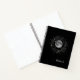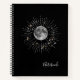 A unique abstract notebook featuring a cosmic moon and starburst design on a black background. Perfect for journalling, school notes, or as a thoughtful gift for dreamers, stargazers, and space lovers.”