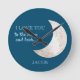 Navy blue and white "I love you to the moon and back" wall clock for your baby boy's nursery or bedroom. Personalized with a name. Contact us for help with customization or to request matching products.