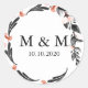 Designed to match our Moonlight Bloom collection, round stickers feature a wreath of leaves and flowers in pink grey black watercolor tones and your initials or monogram and wedding date .