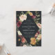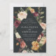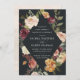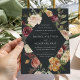 Elegant floral wedding invitations feature your details nestled inside an elongated diamond surrounded by watercolor roses, mums and greenery in rustic autumn colours including peach, ivory, blush, burgundy and green. A rich off-black background adds depth and elegance to this chic invitation for fall or winter weddings.