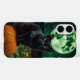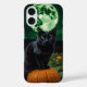 A magical Halloween design showing a black cat with glowing green eyes sitting on a carved pumpkin under the full moon. The spooky yet mystical vibe makes it a perfect seasonal accessory for cat lovers and Halloween fans.