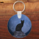 A calm black cat gazes up at the sky on a clear night under a full moon.