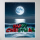 A whimsical and festive wall decor featuring a large, full moon shining over a calm ocean at night. The words "HAPPY CHRISTMAS" are written in bold, red and green 3D letters, partially submerged in the water, creating a playful and unique Christmas scene.