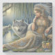 Under the tranquil glow of the moonlight, a serene woman rests by a forest stream, her elegant posture exuding contemplation. Adorned with an ornate headdress and finery that echoes the forests own intricate patterns, she shares a silent communion with a majestic grey wolf. In the background, the shadows of wolves meld with the twilight-draped trees, creating a harmonious fusion of wild spirit and peaceful reverie.