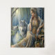 Under the tranquil glow of the moonlight, a serene woman rests by a forest stream, her elegant posture exuding contemplation. Adorned with an ornate headdress and finery that echoes the forests own intricate patterns, she shares a silent communion with a majestic grey wolf. In the background, the shadows of wolves meld with the twilight-draped trees, creating a harmonious fusion of wild spirit and peaceful reverie.