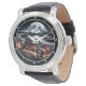 This dramatic watch features a black hot rod with fiery flames speeding down a road under a huge, glowing full moon. The grayscale landscape with vibrant car details creates a striking contrast. Perfect for car enthusiasts, this unique timepiece is a bold and distinctive accessory.