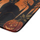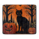 A sleek black cat sits perched beneath a glowing full moon, casting an enigmatic silhouette against the vibrant orange sky. Silhouetted trees and pumpkins scattered below add a touch of whimsy to the scene. Did you know that in ancient Egypt, cats were revered as sacred animals and were often associated with the goddess Bastet, who represented protection, pleasure, and good health? This artwork captures the mystique of Halloween night and the feline's enduring connection to the supernatural.