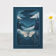 A delicate winter moth rests on a snowy hill beneath a softly clouded night sky in this layered papercut-style illustration. Surrounded by stylized foliage, falling snow, and pine-covered hills, the scene evokes quiet wonder and emotional stillness. The moth’s pale wings and intricate markings contrast gently with the cool blues of the forest, creating a tranquil, dreamlike composition.