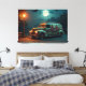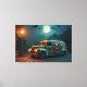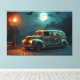A captivating canvas showcasing a vintage van with a striking skull and roses motif, parked on a cobblestone street under the light of a full moon. The warm glow of a solitary streetlamp illuminates the retro vehicle, casting soft shadows across the ground. The atmospheric scene is enhanced by two bats flitting across the moonlit sky, blending vintage charm with a touch of the macaber. This artwork evokes both nostalgia and mystery, making it a mesmerizing