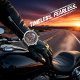 This striking watch face showcases a custom motorcycle engulfed in dynamic orange and red flames, tearing down a road under a dramatic full moon. The dark, cloudy night sky and distant pine trees create an intense backdrop. Silver numbers and watch hands complete this bold design, appealing to motorcycle enthusiasts and lovers of dramatic art.
