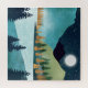 A beautiful landscape with unique textures showing a mountain lake landscape with a rising moon and starry sky in shades of blue, gold, green, and turquoise.