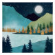 A beautiful landscape with unique textures showing a mountain lake landscape with a rising moon and starry sky in shades of blue, gold, green, and turquoise.