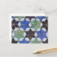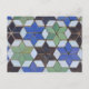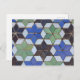 Arabesque architecture detail with a Moorish mosaic from Andaulusia, Spain in green, blue, purple, and white showing a geometric hexagonal start pattern.