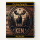 A striking wooden carving of a moose stands proudly against a backdrop of forest and mountains, evoking the beauty of nature at sunrise.