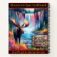 A stunning moose stands gracefully beside a serene lake with a majestic waterfall cascading in the background, surrounded by vibrant autumn foliage and towering trees.
