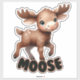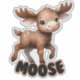 The word "MOOSE" is written boldly at the bottom of the design in a cheerful, bubble-style font. The light grey letters outlined in soft pink perfectly complement the natural tones of the baby moose, creating a harmonious and playful design. The clean, white border around the sticker ensures it will stand out beautifully on any surface, making it a versatile and eye-catching décor item.
