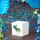 This design is the outline of a moose with a green to beige colour gradient and the silhouette of a tree inside.