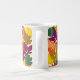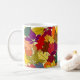 This mug has a design of a pile of leaves in green, yellow, orange, blue, brown, and red on a field of pale yellow.