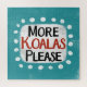 "More Koalas Please" is a cute text design in blue with black and red text, along with a white accent shape and white textured whimsical dots surrounding it.