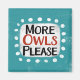 "More Owls Please" is a cute text design in blue with black and red text, along with a white accent shape and white textured whimsical dots surrounding it.