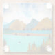 An abstract landscape with unique textures showing a mountain and lake scene with a solitary rowboat and a stunning sunrise and sunrays in shades of blue, teal, cyan, and gold.