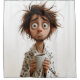A whimsical and relatable illustration of a dishevelled man in a bathrobe clutching a cup of coffee with wide, tired eyes. His messy hair and bewildered expression perfectly capture the chaos of early mornings before caffeine takes effect.