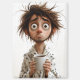 A whimsical and relatable illustration of a dishevelled man in a bathrobe clutching a cup of coffee with wide, tired eyes. His messy hair and bewildered expression perfectly capture the chaos of early mornings before caffeine takes effect.