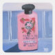 Art print of a pink shampoo bottle on blue tile.