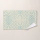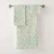 Thick, velvety towel set features a classic Moroccan Onion tile pattern in warm earthy shades of Glacier Blue (a cool light aqua shade) against a cream coloured background. Gender neutral, this beautifully rich design was often a favourite in Victorian homes (& castles!) yet blends with almost any style of decor.
