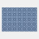 Wrapping paper in a Moroccan inspired tile pattern in navy and light blue, deep fuchsia and pastel pink, and turquoise and aqua