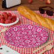 Paper plates in an Art Deco Moroccan inspired tile pattern - deep fuchsia pink with a pastel pink background