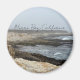 A foggy overcast day in Morro Bay California with the ocean waves hitting the rocks on the shore in this beach photograph souvenir. This seaside travel photo keepsake magnet features black cursive script above the beach rocks and grey sky.